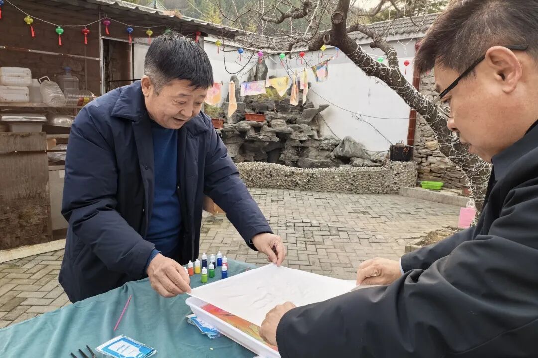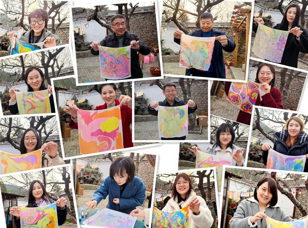 品嘗完甜蜜的糖葫蘆,大家又紛紛投入到水拓畫絲巾活動中。創(chuàng)作、水拓、固色再到晾干,隨著一幅幅色彩斑斕的畫作拓印于絲巾之上,大家由衷地發(fā)出歡呼和贊嘆,欣賞著這份獨(dú)一無二的美,感受非物質(zhì)文化遺產(chǎn)水拓畫的獨(dú)特魅力。水拓絲巾的制作不僅考驗(yàn)著大家的耐心與細(xì)心,更是一次對美的追求與探索。